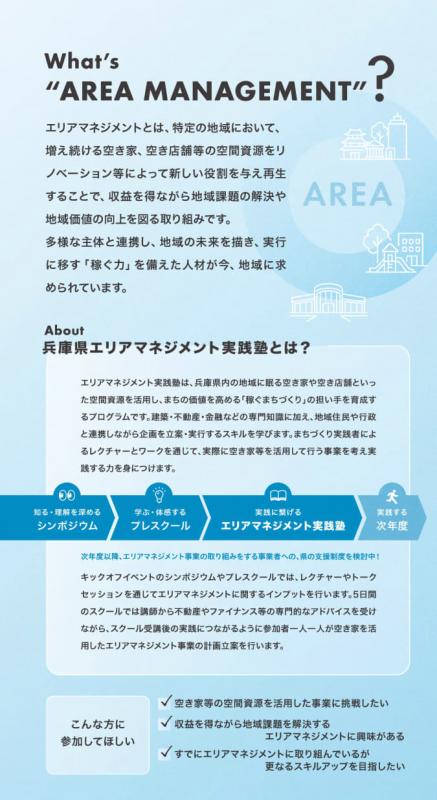 県内の特定のエリアにおいて、エリアマネジメントに関する高度なノウハウを持ち、地域の活性化や空き家活用の促進を目指して積極的にエリアマネジメントに取り組む民間の団体について、「兵庫県エリアマネジメント団体」として認定を行う制度です。