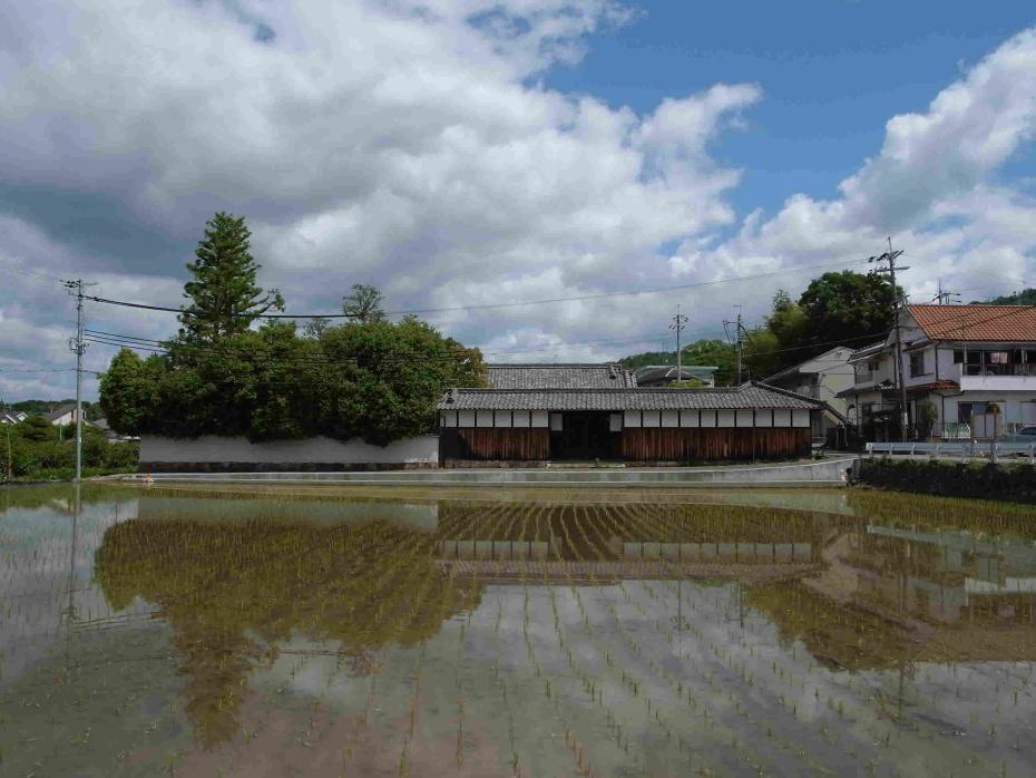 | 川西市の東多田市道から見る田んぼと旧庄屋屋敷 |