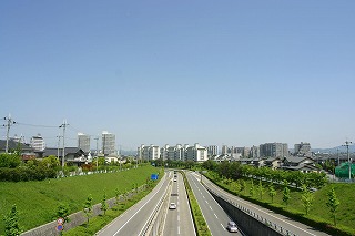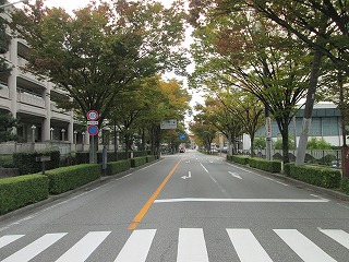 | 宝塚市役所前通り(宝塚新大橋南詰交差点)から見る宝塚市役所前ケヤキ並木 |