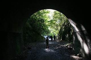 冒険気分を味わいながら、暗いトンネルを抜けると武庫川の渓谷美が視界いっぱいに広がります。ハイキングコースとしても人気です。 撮影:宝塚市都市計画課 |