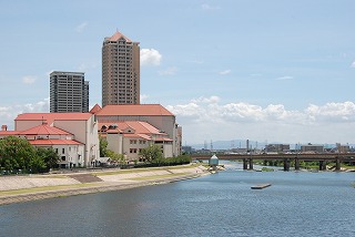 オレンジの屋根と白い外壁の宝塚大劇場と、武庫川が見える景色は、宝塚らしい景観です。 撮影:宝塚市都市計画課 |