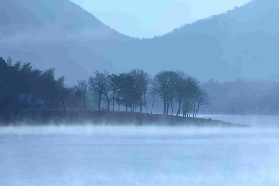 冬の千丈寺湖では頻繁に気嵐に出会うことができます。見るたびに心が洗われます。 撮影:塩田和久 |