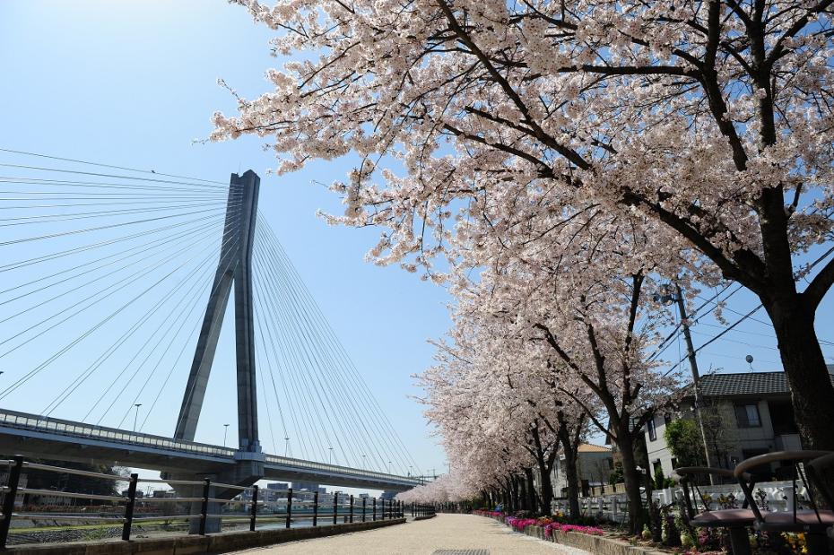 新猪名川大橋、通称ビッグハープは阪神高速道路の延伸部で、猪名川に架かる橋です。橋付近の河川敷では、桜と橋梁のコントラストが美しい、春らしい景観を見ることができます。 撮影:川西市都市政策課 |