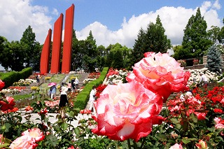 | 荒牧バラ公園から見るバラの花壇や大型モニュメントなど |