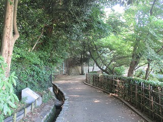 | 古い石積み擁壁とその上に作られた漆喰の塀。 石垣からは草や苔が生え歴史を感じさせる。 |