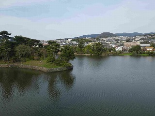 阪急電鉄今津線に乗車していると見える宝塚らしい景観です。池の周囲には遊歩道もあり、池と斜面地に建つ住宅と背景の甲山とが調和した景観スポットです。 撮影:宝塚市都市計画課 |