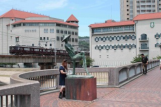| 武庫川に架かる宝塚大橋から宝塚大劇場と阪急電車を歩道上野外彫刻と合わせて撮影。宝塚の代表的な風景かと思います。 |