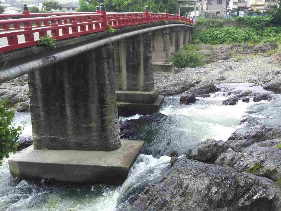 | 多田神社のすぐ南の御社橋。赤い欄干の下の岩場を轟々と流れる猪名川は、大阪近郊という交通至便の地を忘れさせ、何かしら神々しい物を感じます。 |