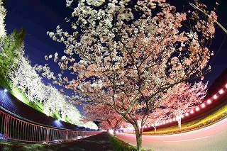 | い~な!!さくら通りは町道原広根線の愛称で、4月上旬にいながわ桜まつりと桜のライトアップが行われており、約600本のソメイヨシノの夜桜が幻想的です。 |