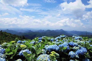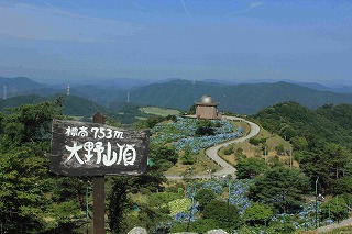 | 阪神間地域最高峰、753mの大野山山頂付近からは山々がそびえ立ち、7月初旬には色鮮やかな約16,000株の満開のあじさいを楽しむことが出来ます。 |