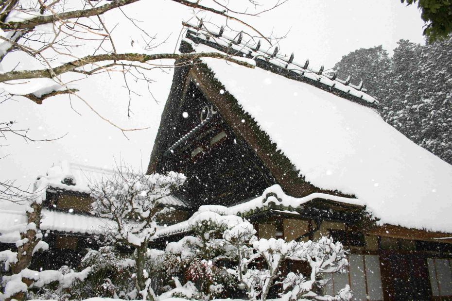 | ひょうご住宅百選にも選ばれている静思館は、一般に公開している文化施設です。冬にはシトシトと降った雪が茅葺屋根にどっしりと積もり、その景色は見ごたえがあります。 |