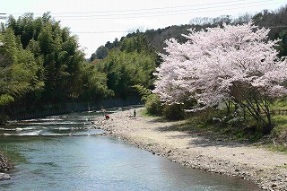 | 猪名川町 北田原ます釣り場から見る春を感じる桜と清流猪名川 |