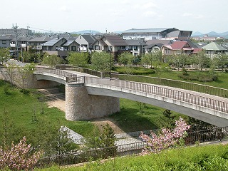 | 赤い橋と猪名川。季節ごとに変化する木々により一年中楽しめます。 |