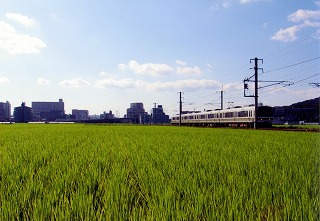 | 三田市桑原の市道から見る田園風景を駆け抜ける電車 |