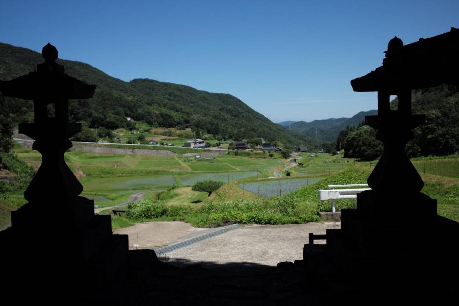 | 八坂神社の石灯籠から棚田を望む。 この地で大切に信仰されてきた八坂神社の境内を出れば、眼下一面にこの景色が広がる。 |
