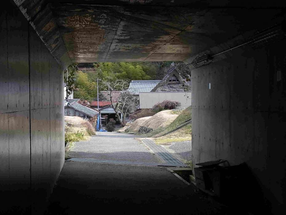 | 大阪や神戸から有馬温泉に至る有馬街道沿いに古い茅葺き民家が残る。船坂の集落を見るには、側面からとなるが、新しくできたこのトンネルからがおすすめ。 |