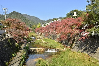 | 山芦屋町を望む芦屋白橋から見る山芦屋町の町並みとその向こうに広がる六甲山 |