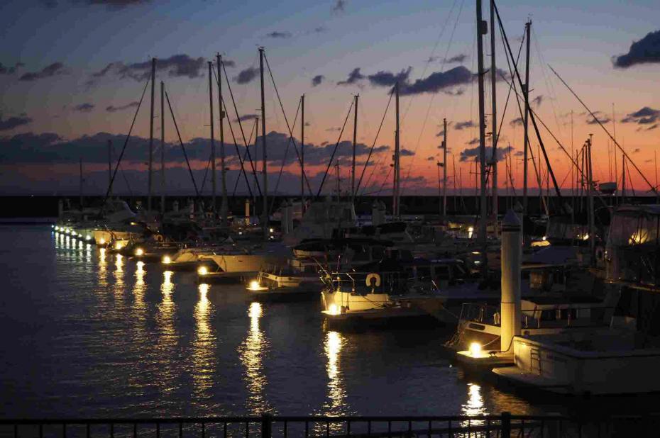 碇泊中のヨットのバックに、マジックアワーの空が幻想的で、しばし時の経つのを忘れるくらい綺麗です。 撮影:石井 尚子 |