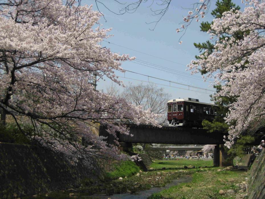 | 春になると桜が見頃な夙川沿い。 阪急電車と合わせて撮影しました。 |