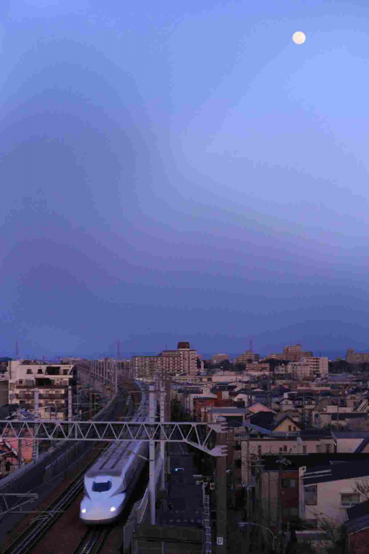 | 六甲トンネルに突入する新幹線を身近に見られる貴重なポイント。 フェンス越しですが、きれいな月とのぞみがワンフレームに収まる、なかなか貴重なお立ち台です。 |