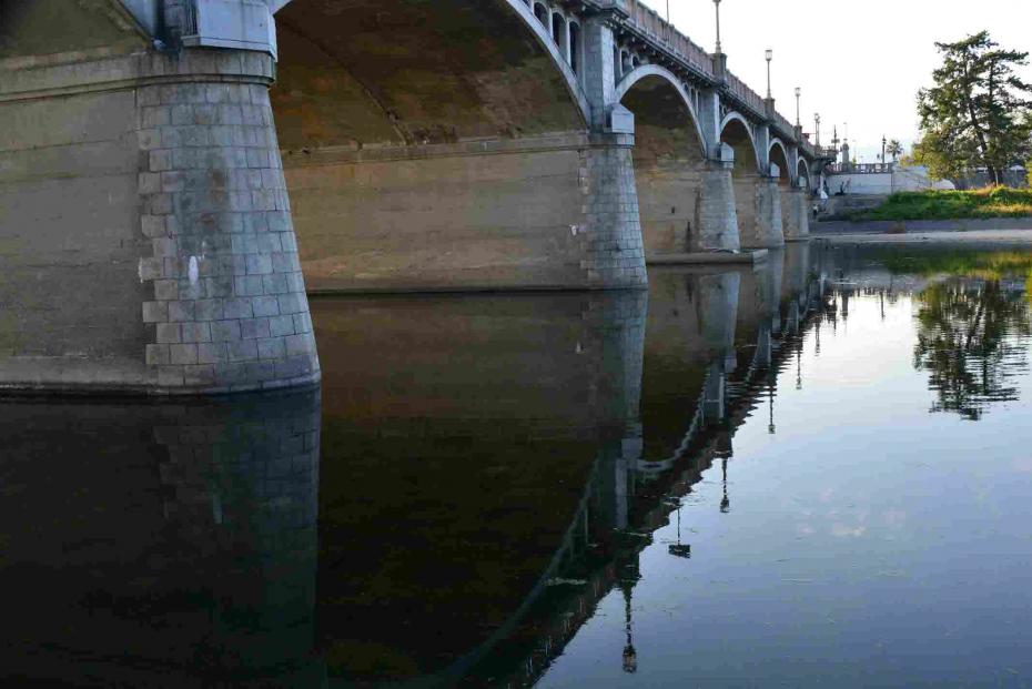 | 尼崎市稲葉荘の武庫大川河川敷から見る川面に写る「武庫大橋」 |