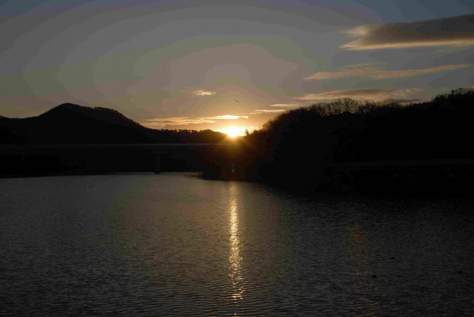 | 西宮市山口町金仙寺湖畔北側から見る対岸に昇る「初日の出」 |