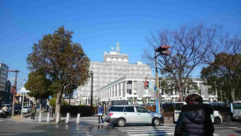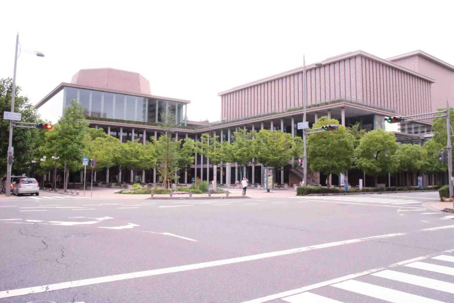 | 尼崎市役所は設計者村野藤吾の代表建築のひとつであり、緑あふれる橘通りから見る風景は、季節感を感じながらより建物の雄大さを感じられる。 |
