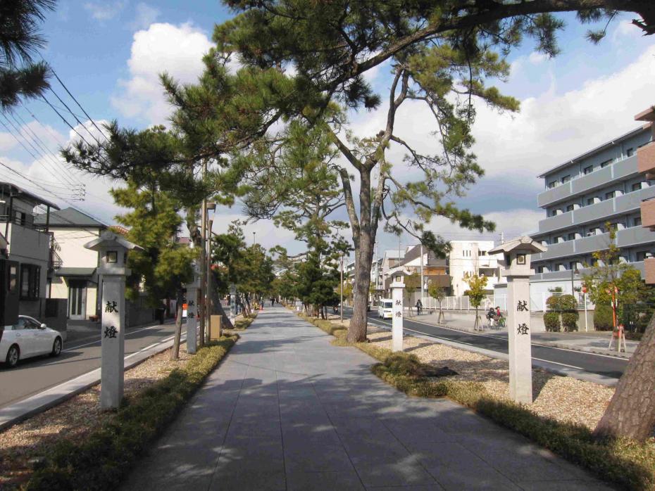 | 西宮市広田神社参道から見る石畳の参道松並み木と周辺の街並み景観 |
