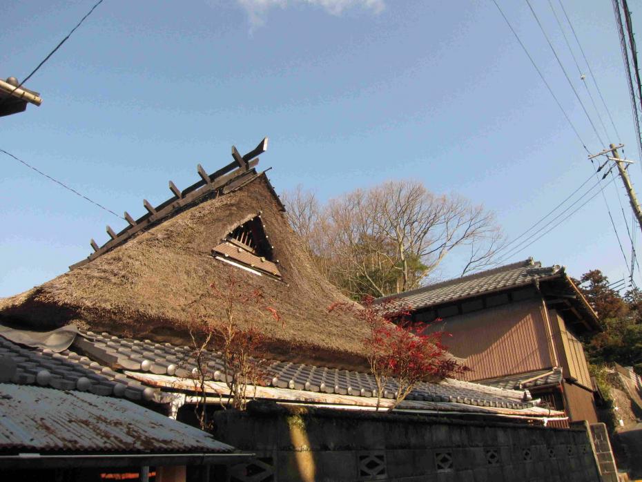 | 西宮市山口町船坂の有馬街道から見る有馬街道沿いの茅葺き屋根と背後に広がる山並み樹木の調和風景 |