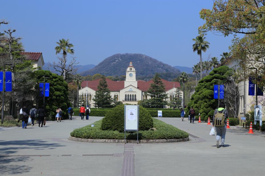 | 西宮市上ヶ原一番町の学園正面から見る関西学院大学の「時計台と甲山」 |