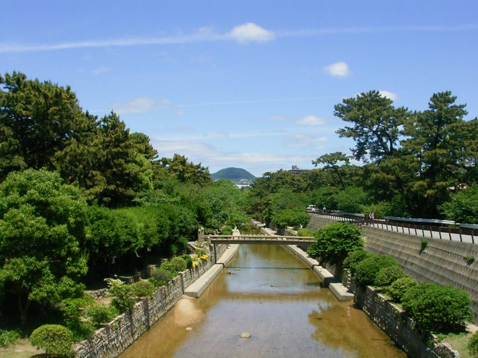| 浜夙川橋から見る緑あふれる夙川公園と西宮市のランドマークである甲山 |