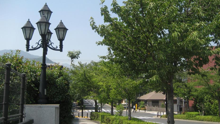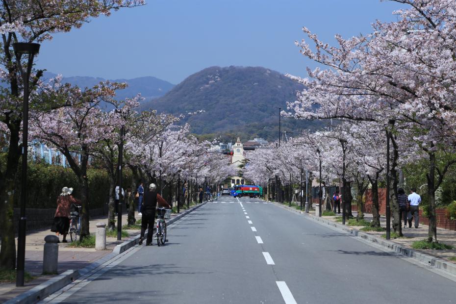 関西学院大学、甲山へと向かって続く学園花通りの桜並木が美しい街路景観を創出している。 撮影:西宮市都市デザイン課 |