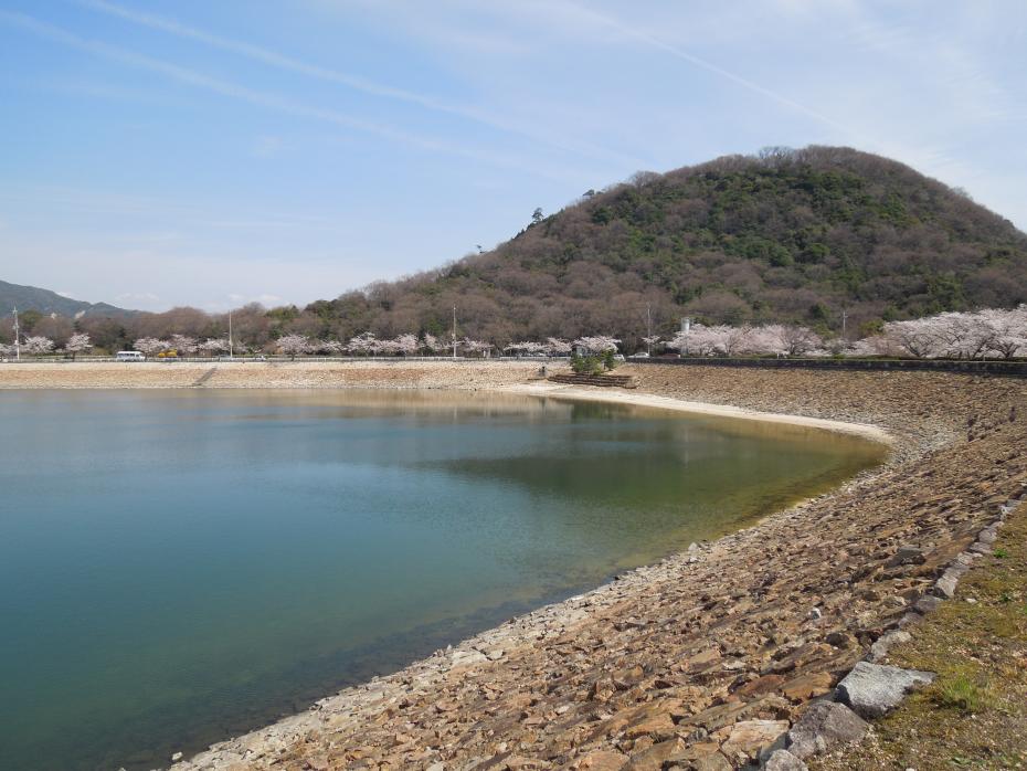 北山貯水池の周囲を彩る桜と背景の甲山が美しい景観を創出している。 撮影:西宮市都市デザイン課 |