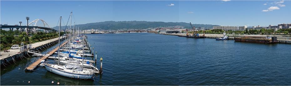 手前にヨットハーバーと西宮大橋を見ながら海の青とその向こうに見える六甲山麓の緑を感じることができる。 撮影:西宮市都市デザイン課 |