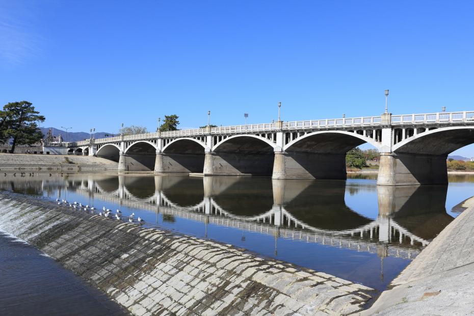 尼崎市、西宮市間の武庫川にかかる国道2号線上の橋で、高欄や街灯の意匠が歴史を感じさせる。また、バルコニーが設置されている。 撮影:尼崎市開発指導課 |