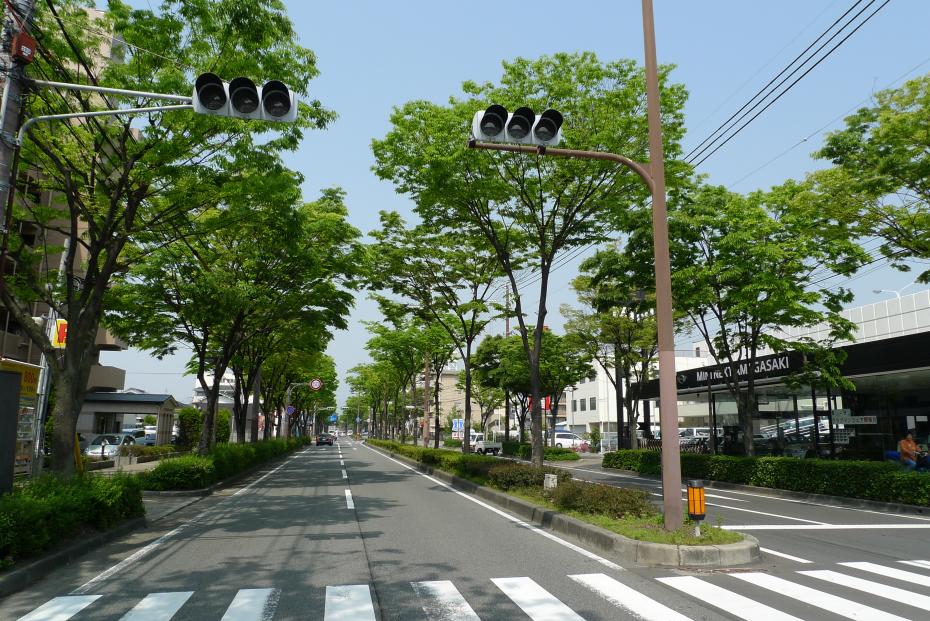 山幹通りの中でもこの辺りはケヤキが3列に植わってトンネル状になっており連続した緑の塊がまちの景観に潤いを与えている。車で走っていても、緑の木漏れ日の中を抜けていく感じが気持ちいい。 撮影:尼崎市開発指導課 |
