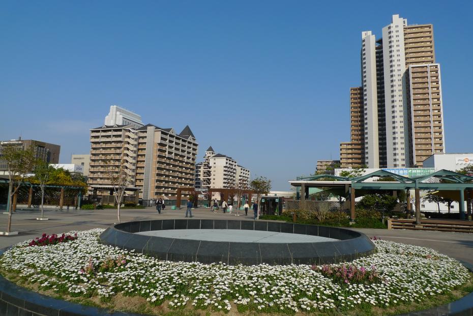 彩り鮮やかな花壇が駅に降り立つ人の目を楽しませてくれる広場。シンボルとなるタワーマンションが駅前の顔をつくりだしています。 撮影:尼崎市開発指導課 |