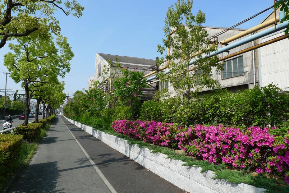 花や木を組み合わせた道路沿いの緑地が工場施設の圧迫感を軽減し、季節館やうるおいを感じられるビューポイントをつくりだしています。 撮影:尼崎市開発指導課 |