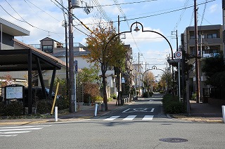 | 阪急塚口駅南側のコミュニティ道路交差点(尼崎市南塚口町)から見るコミュニティ道路とおしゃれなアーチ状の街灯 |