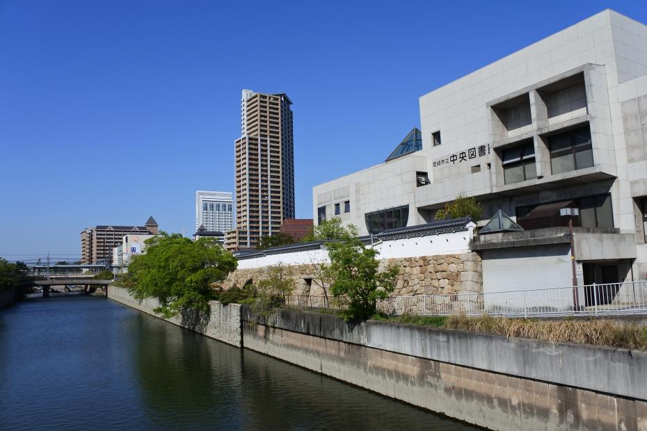 | 開明橋(尼崎市北城内)から見る庄下川から見える中央図書館や城壁 |