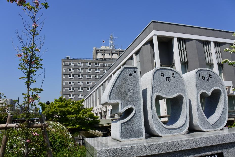 市政100周年を迎えた尼崎をお祝いする石碑と、村野藤吾設計尼崎市庁舎。5月にはツツジや、市の花であるハナミズキが咲き、彩りを与えてくれます。 撮影:尼崎市開発指導課 |