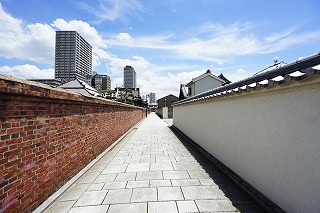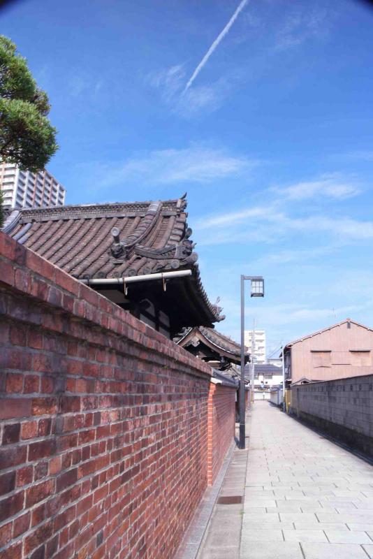| 寺町通りのレンガ塀と青空のコントラスト尼崎の景観のひとつ。 |