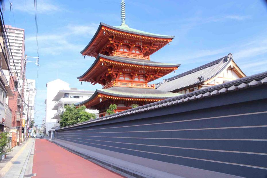 | 寺町通りに延びる壁から見える朱色の三重の塔と青空のコントラストは尼崎の景観のひとつ。 |