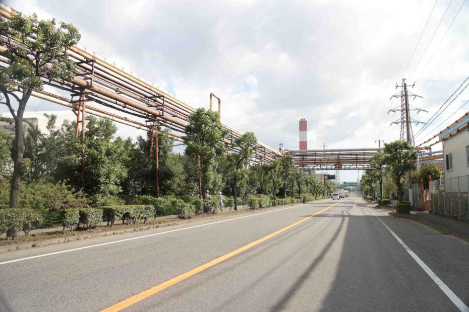 | 主要地方道尼崎港線沿道から見る尼崎の工場地帯内を通る道路沿いの緑地とパイプラインとその奥に見える煙突 |