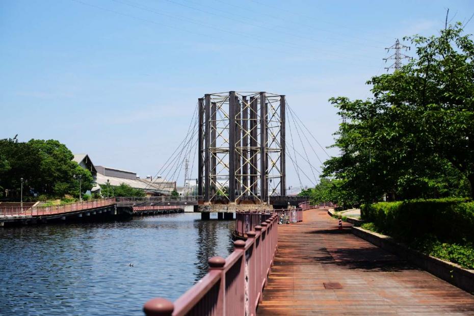 | 北堀であい橋から見る運河にかかる斜張橋とプロムナード |