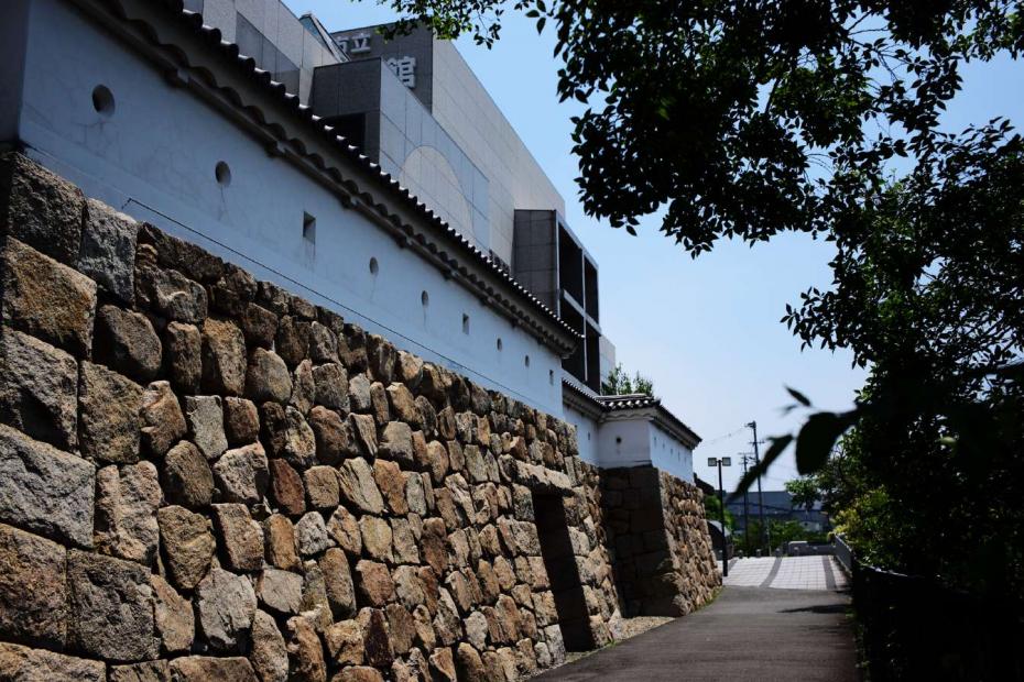 | 尼崎城の雰囲気が残る石垣に調和する図書館建築は尼崎の景観のひとつ。 |