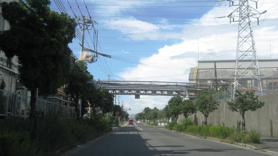 | 道路を横断するようにパイプが走っている。 尼崎臨海部の工場地帯らしい景観。 |