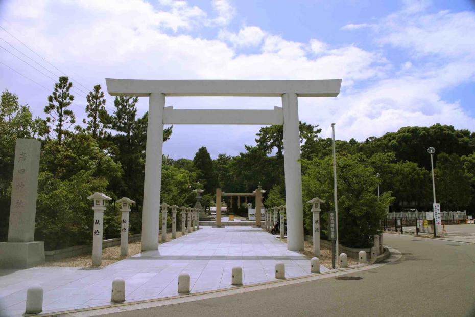 | 鳥居から境内に続く石畳の参道の先に開けた空は西宮らしい景観のひとつ。 |