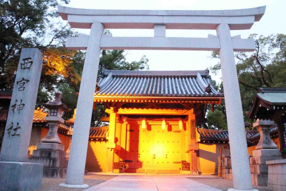 | 鳥居越しに見えるライトアップされ赤門と土塀(日本三大土塀)は、西宮らしい景観のひとつ。 |