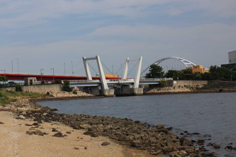 | 御前浜橋から見る宮浜にかかる跳開式の橋と、西宮大橋、西宮港橋 |